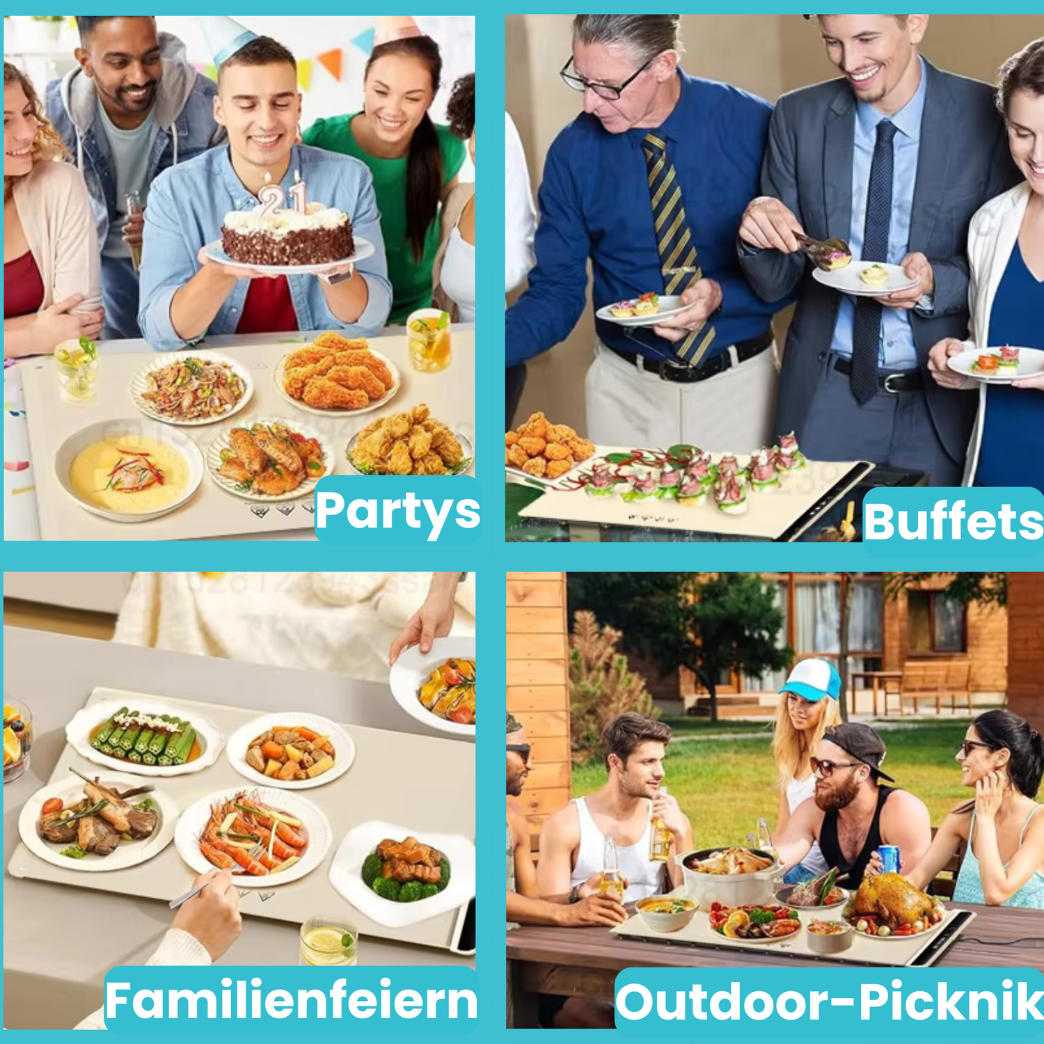 Oder der Stress, wenn Gäste mal zu spät kommen... Ab heute wird Dir das egal sein, denn genau hier kommt unsere heiße Matte ins Spiel! 💡 Sie sorgt dafür, dass Deine Speisen immer genau die richtige Temperatur haben und nicht kalt werden – Egal ob beim Familienbrunch, einem romantischen Dinner zu zweit oder einem ausgelassenen Buffetabend mit Freunden.